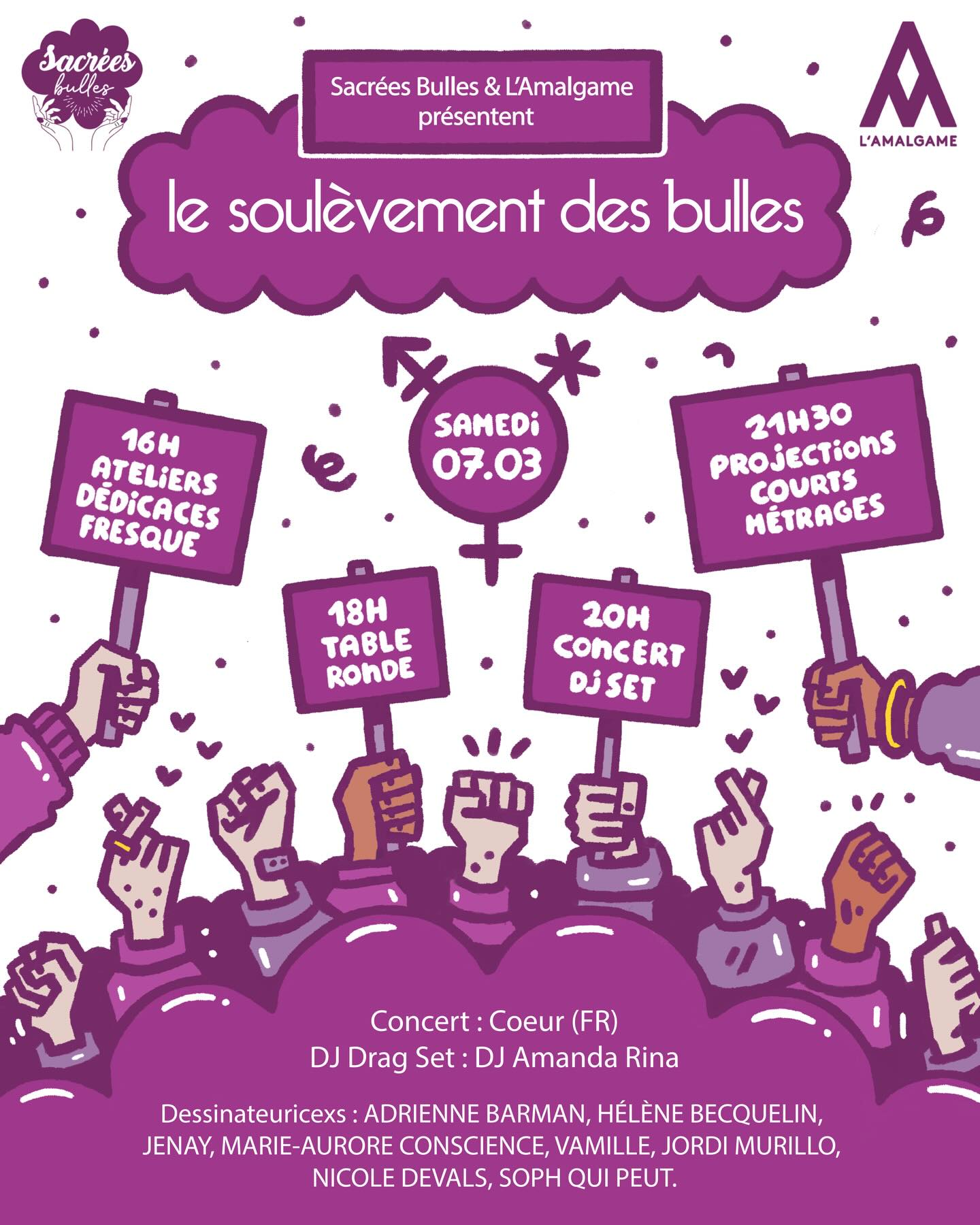 Le Soulèvement des Bulles revient pour une deuxième édition encore plus intense et engagée. Cet événement pluridisciplinaire, féministe et inclusif, fait dialoguer illustration, musique, cinéma, artisanat et rencontres dans une ambiance festive et militante. En collaboration avec Sacrées Bulles, cette nouvelle édition investit L’Amalgame, à Yverdon-les-Bains, pour une soirée où les formes artistiques se croisent et se répondent.